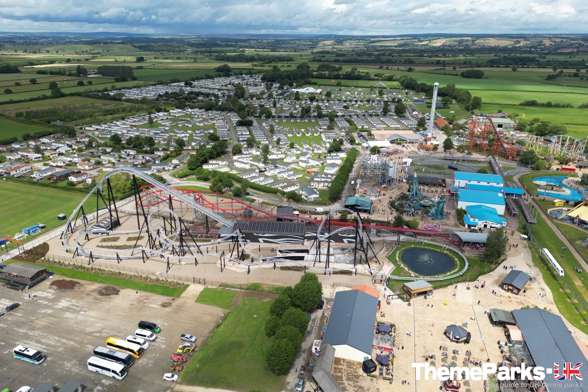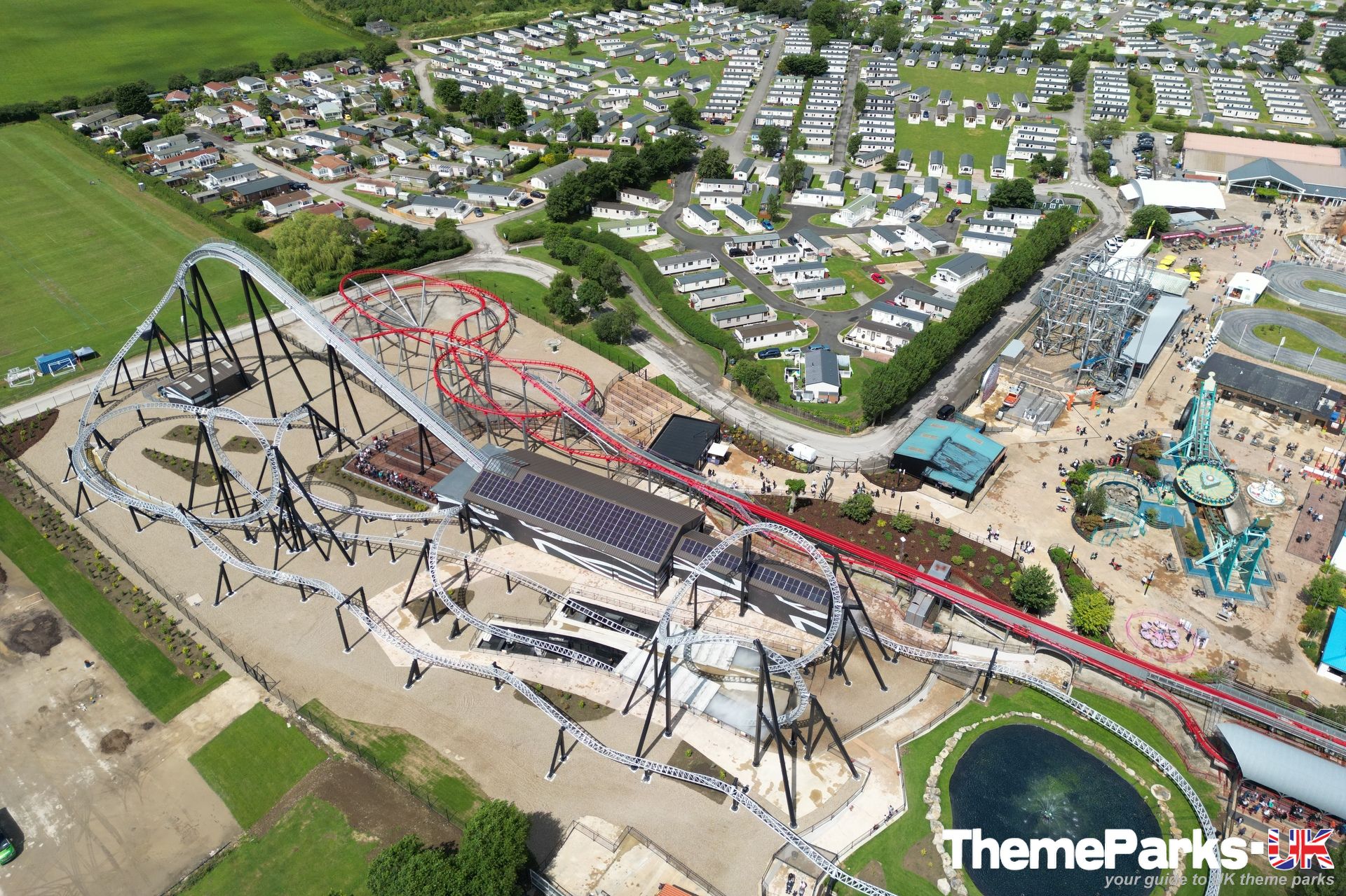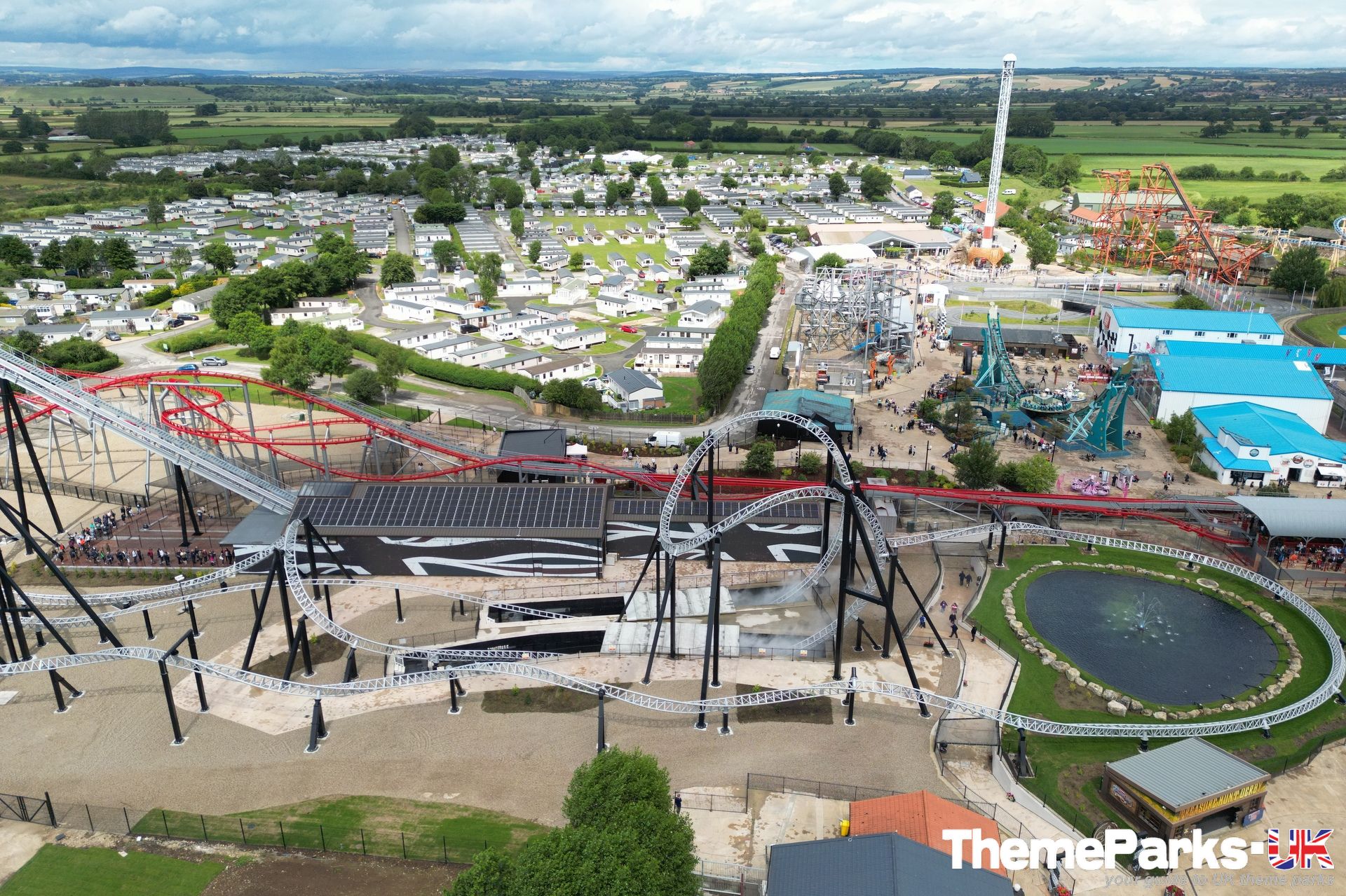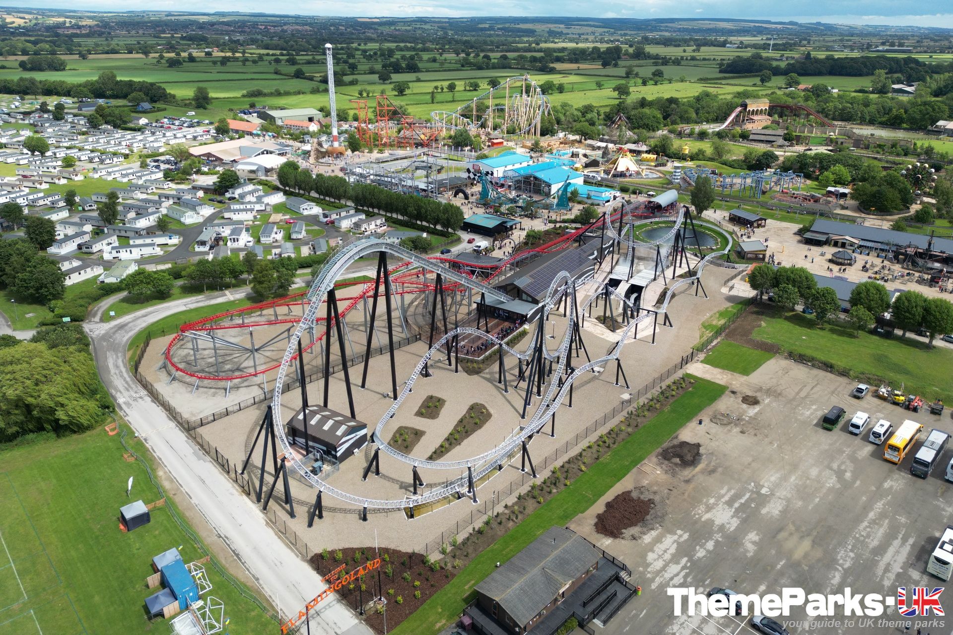 The landscaping around the ride includes a lake with a central water feature, large expanses of gravel and some planting. It's definitely styled rather than themed. Where the design excels, is in the attention to detail. A large hoop structure emblazoned with a Flamingo Land logo has been placed at the far end of the ride's signature heartline rolls, creating an unmissable photo opportunity.
