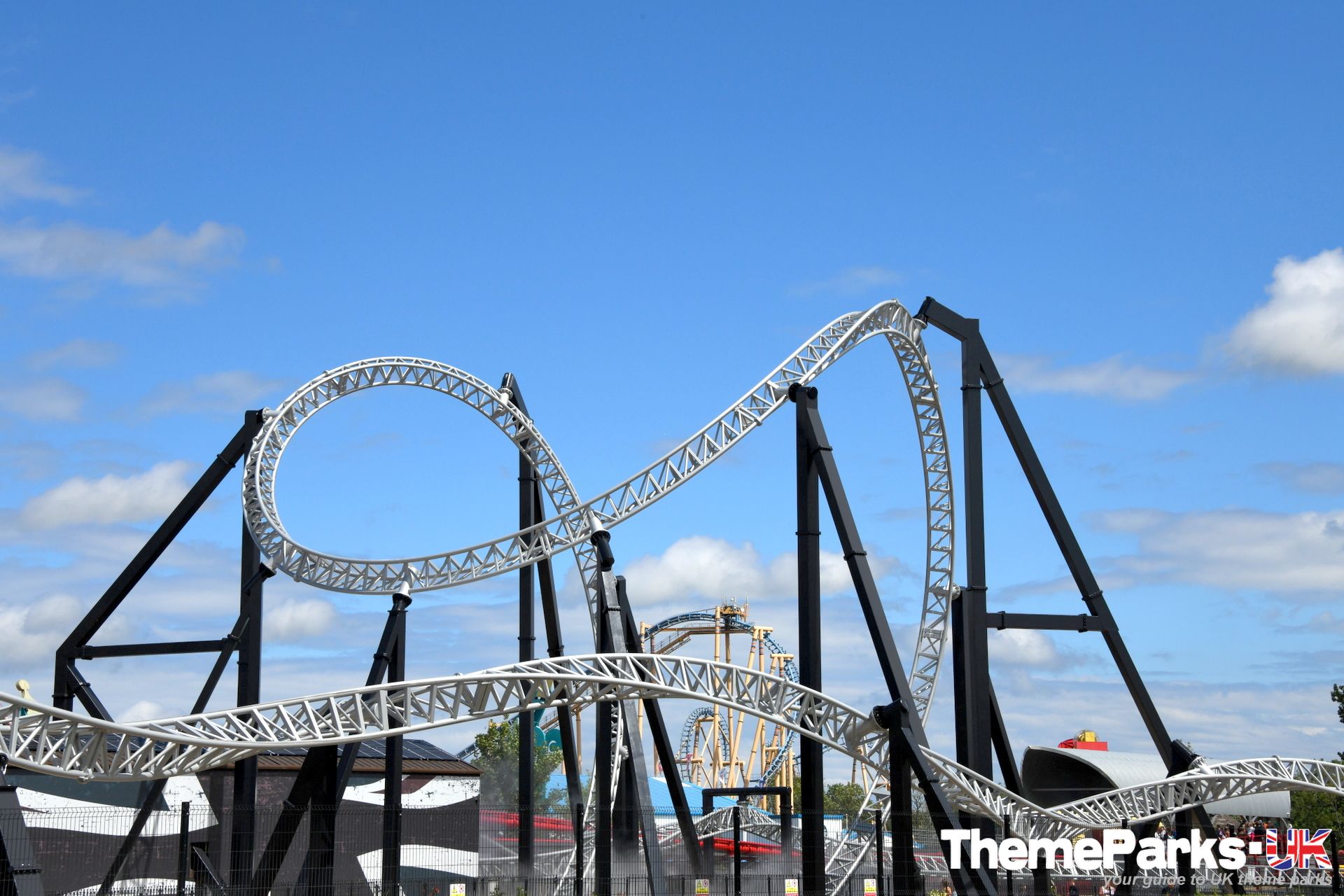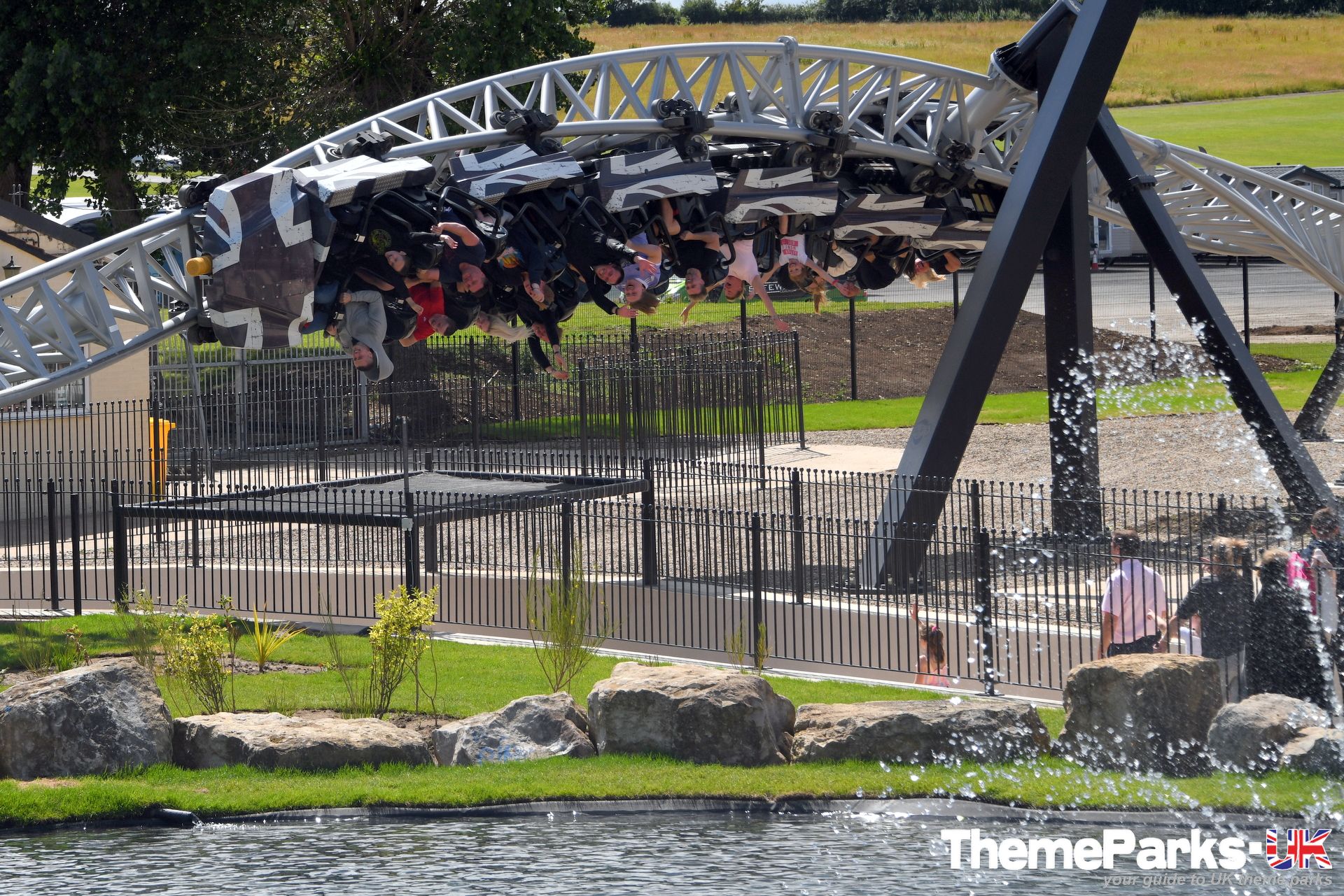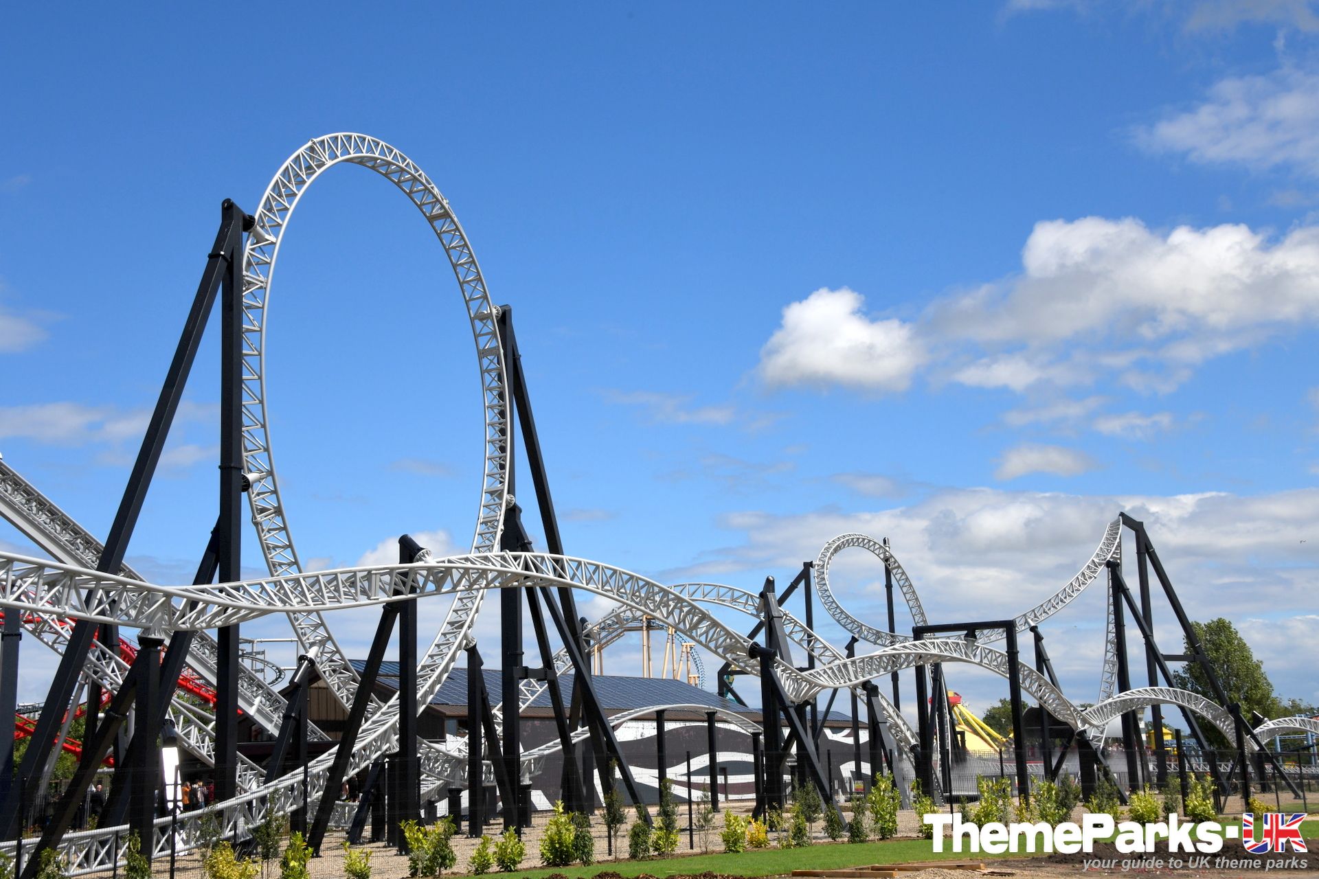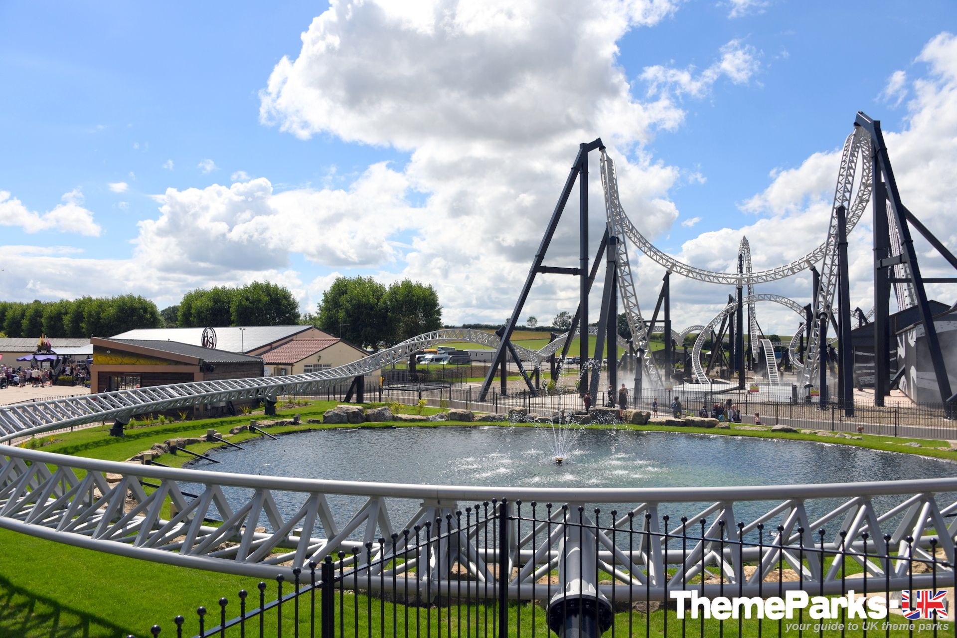 The landscaping around the ride includes a lake with a central water feature, large expanses of gravel and some planting. It's definitely styled rather than themed. Where the design excels, is in the attention to detail. A large hoop structure emblazoned with a Flamingo Land logo has been placed at the far end of the ride's signature heartline rolls, creating an unmissable photo opportunity.