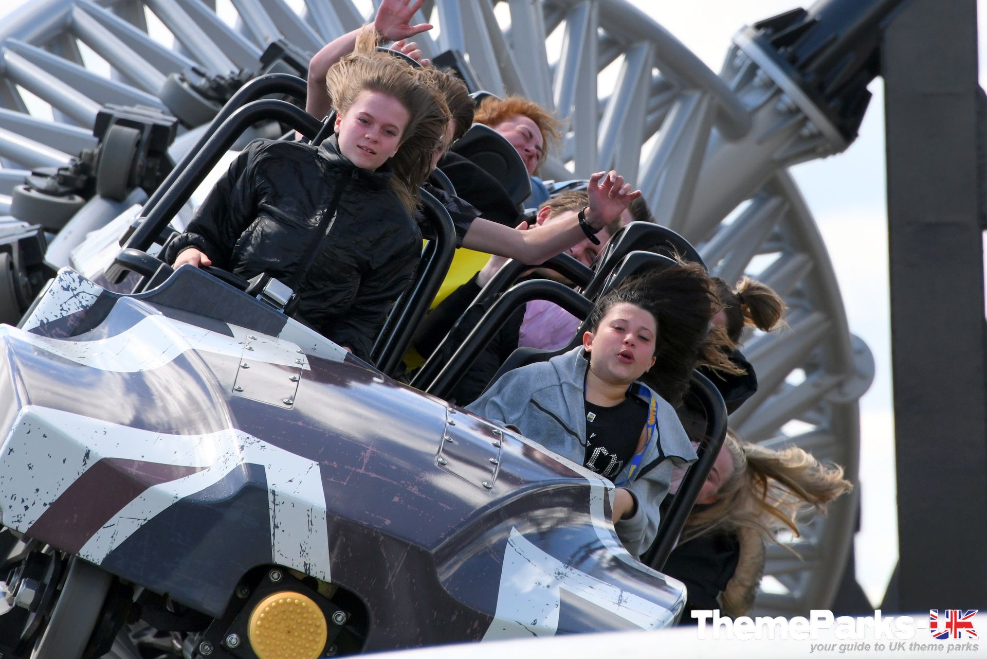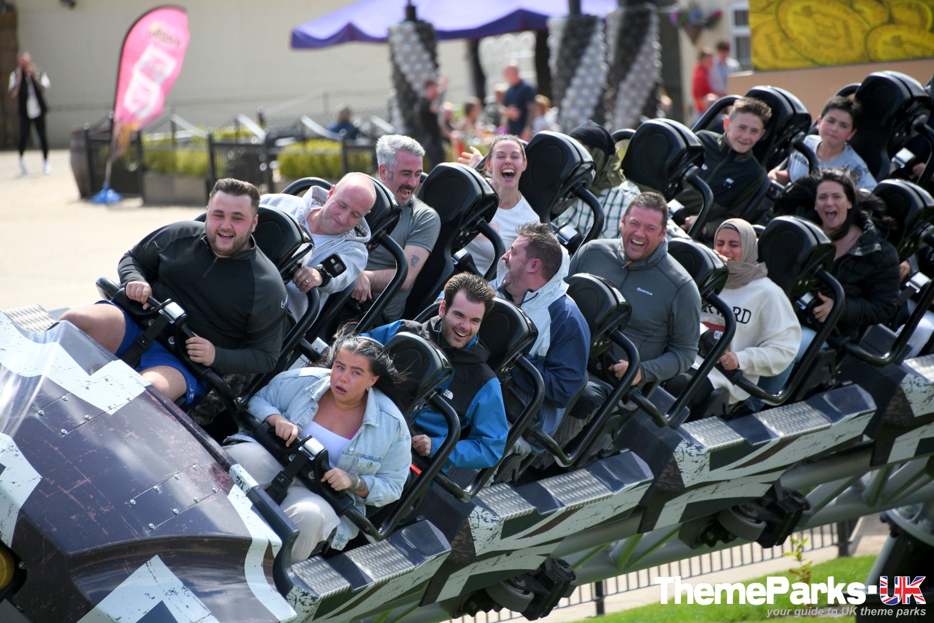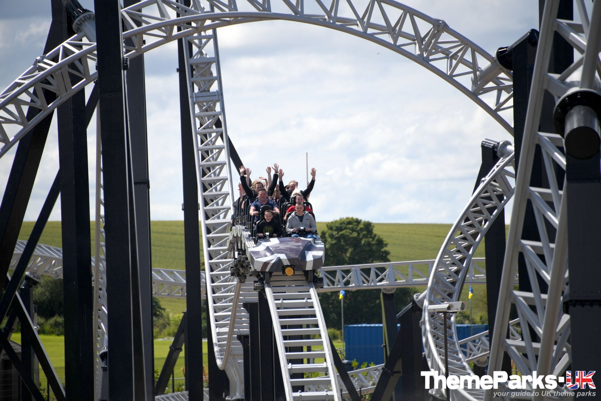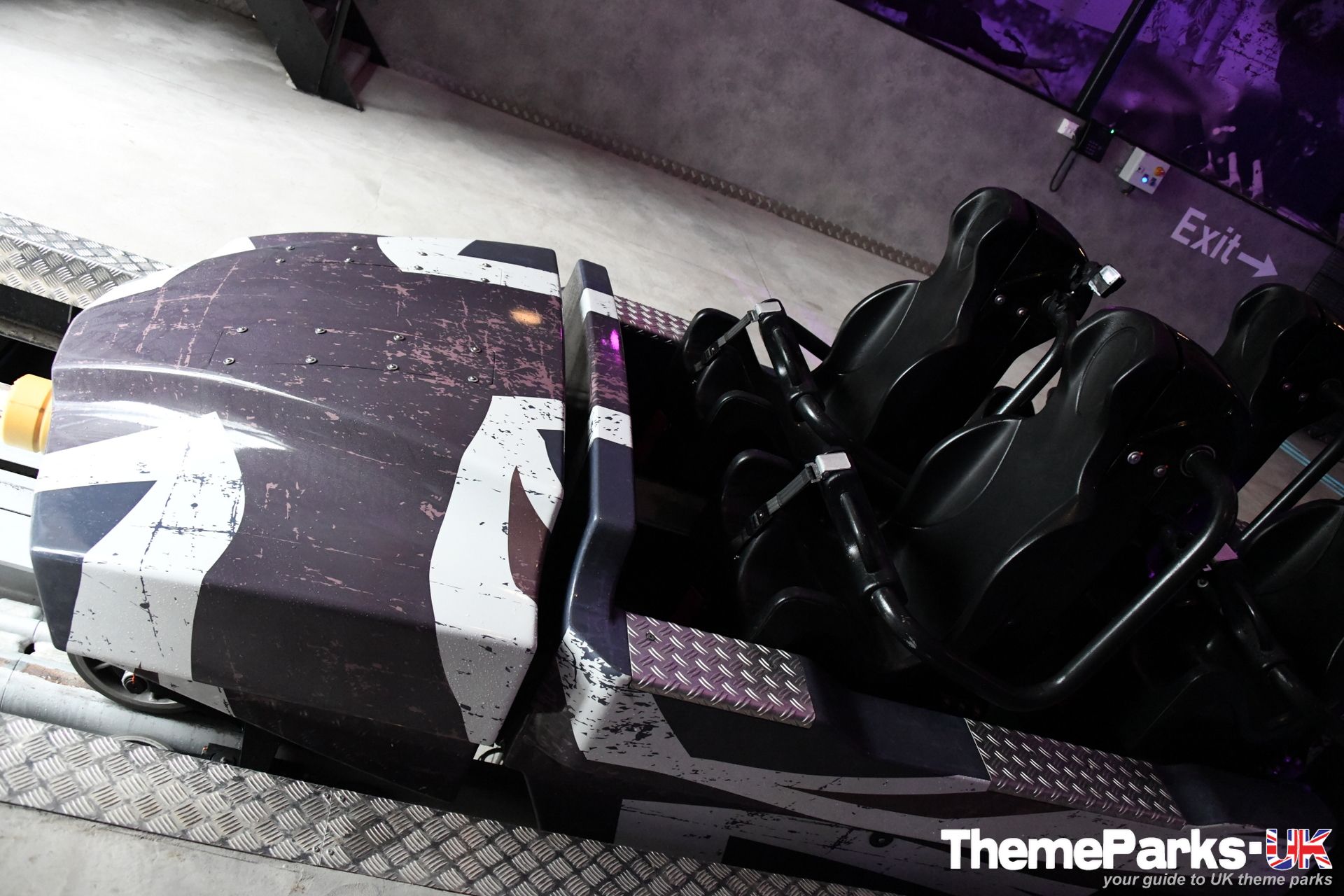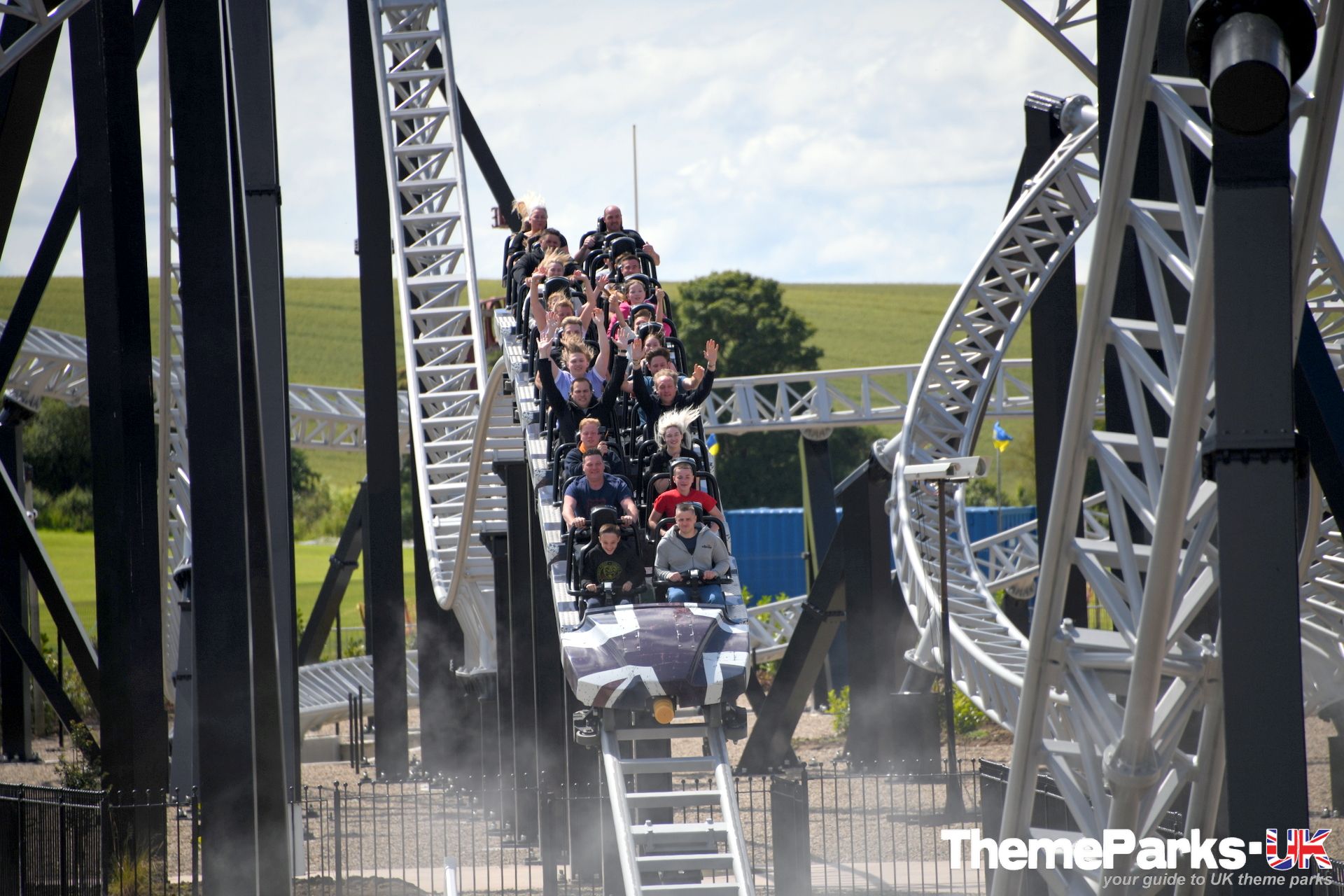 The train design is superior to the old Intamin design, with comfortable lap bars instead of over the head restraints, a vastly improved seating position and far more leg room. It's also significantly smoother than the original ride type, especially at the front of the train. There's currently only one train, but the park has plans to acquire another. It can accommodate 24 riders and features a pre-distressed grey union flag design.