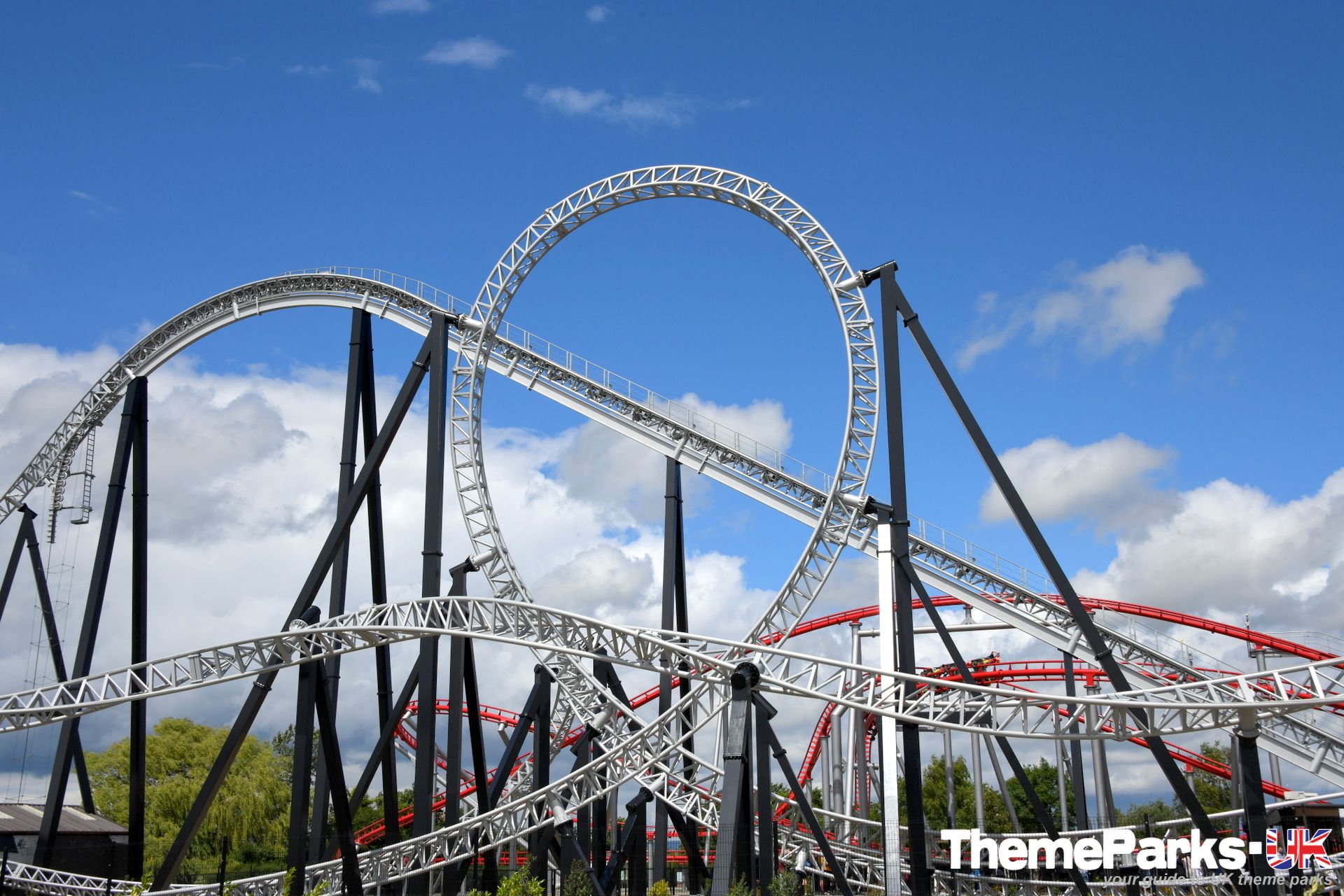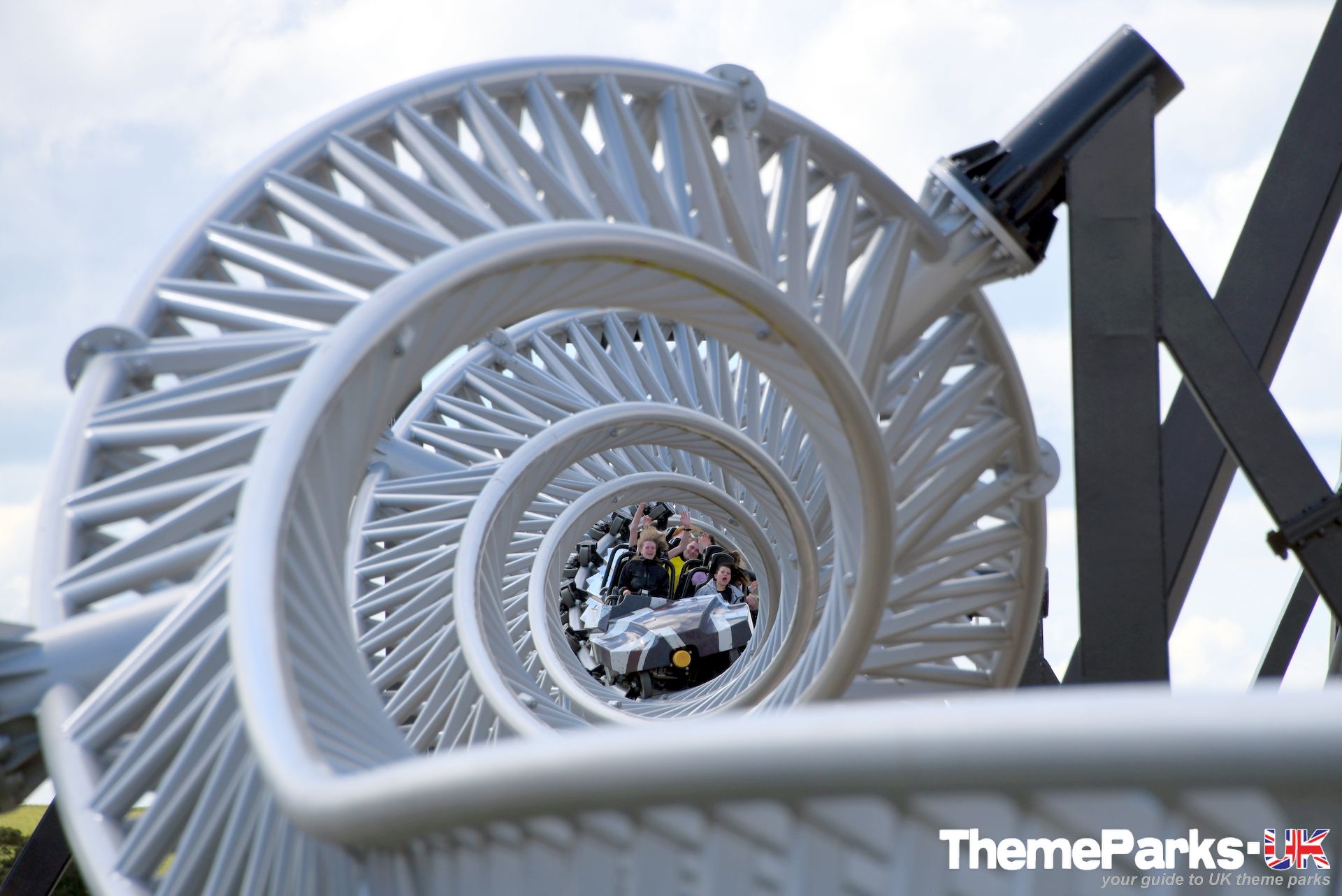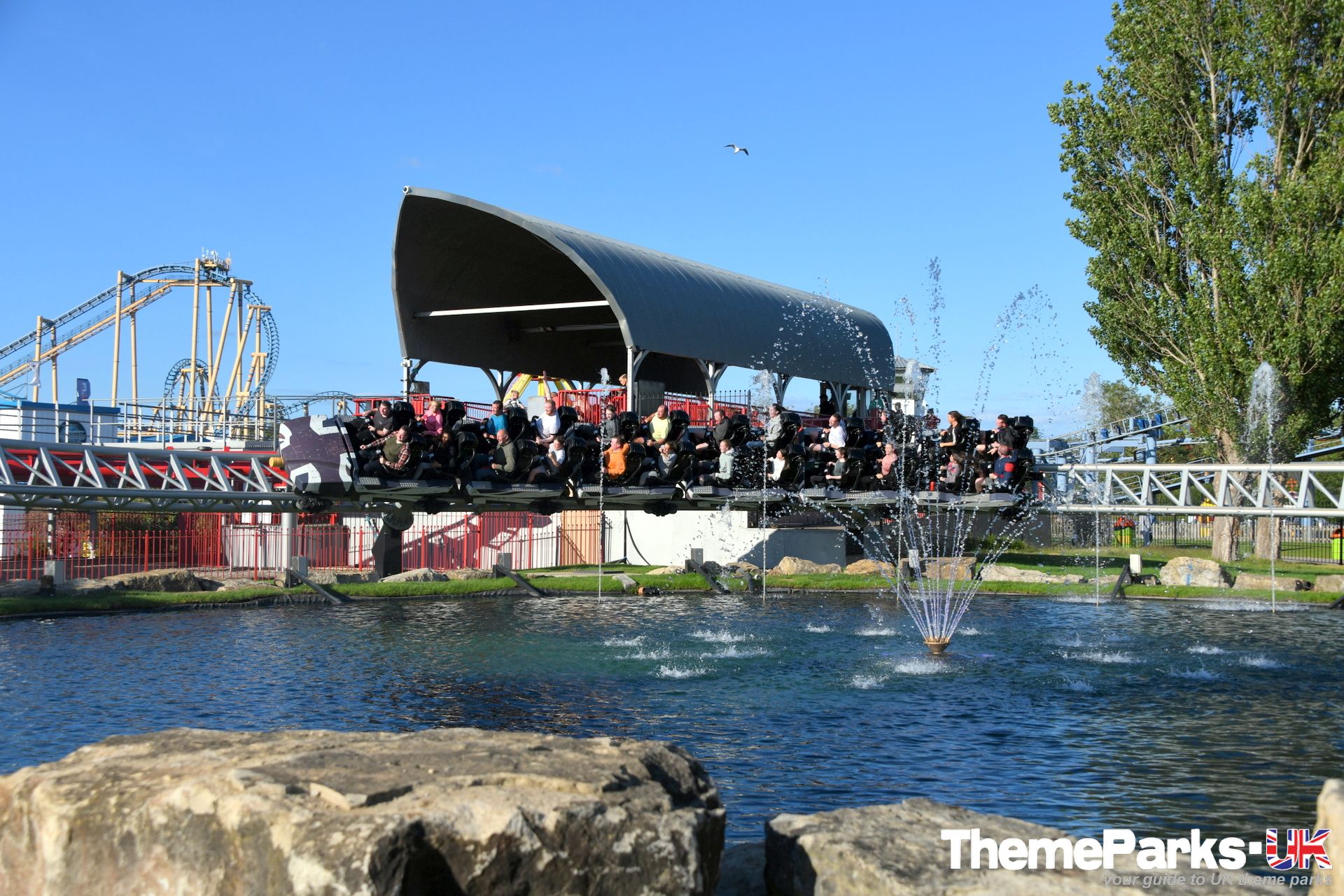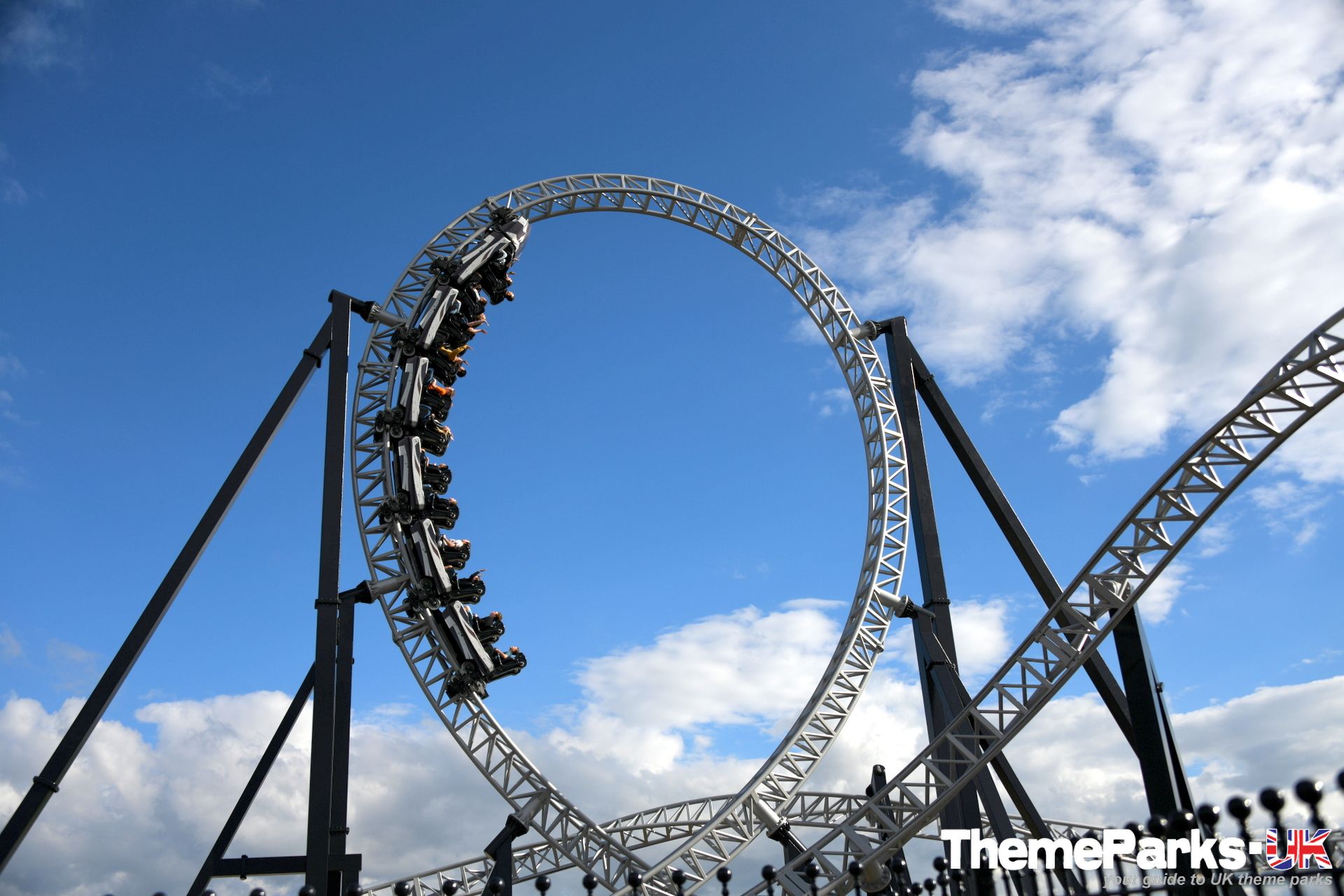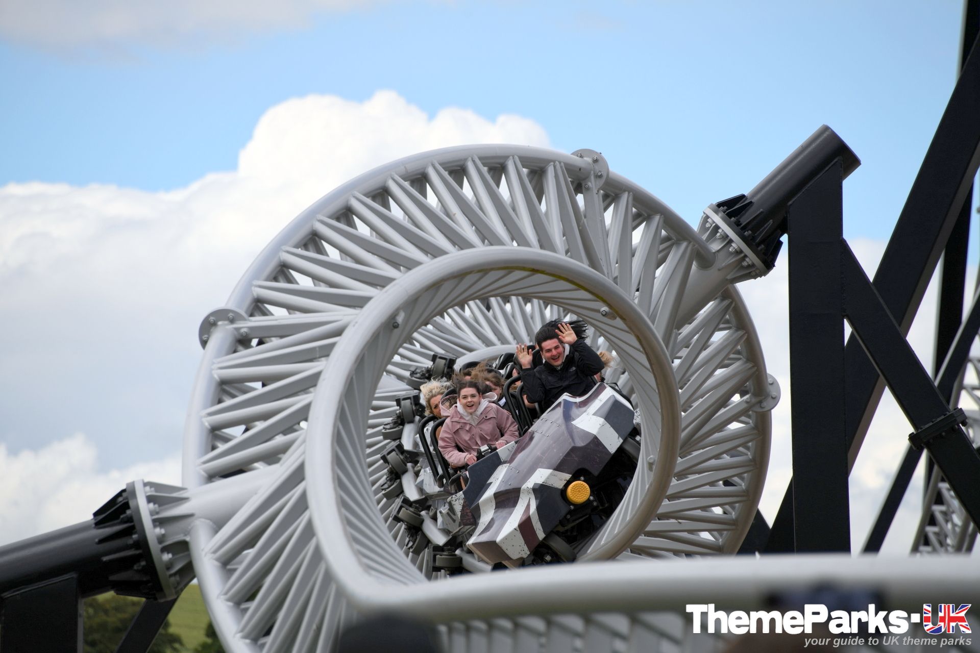 The train design is superior to the old Intamin design, with comfortable lap bars instead of over the head restraints, a vastly improved seating position and far more leg room. It's also significantly smoother than the original ride type, especially at the front of the train. There's currently only one train, but the park has plans to acquire another. It can accommodate 24 riders and features a pre-distressed grey union flag design.