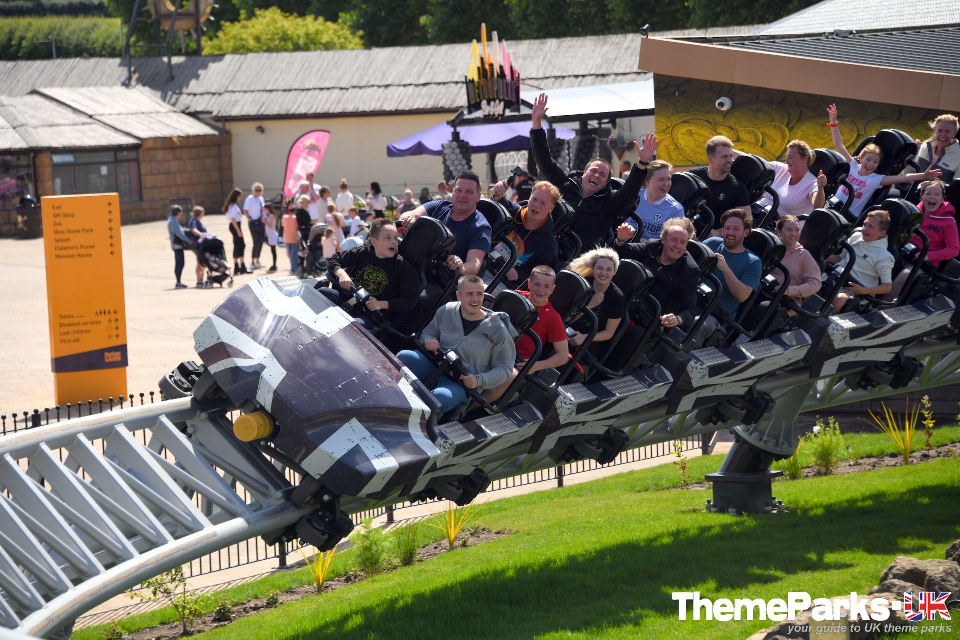 Approaching from the park's entrance area, guests pass under an eye-catching sign and via a walkway that drops beneath the track in two places. This provides a chance to get up close to the train as it flies past, and a viewing area at the base of the imposing cobra roll is perfectly situated for spectators.