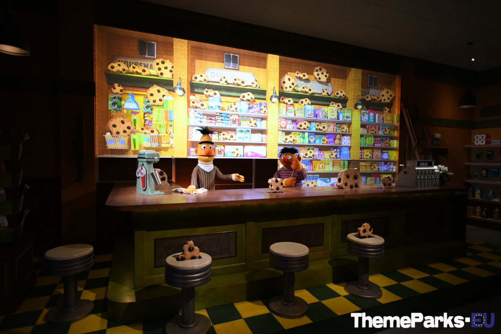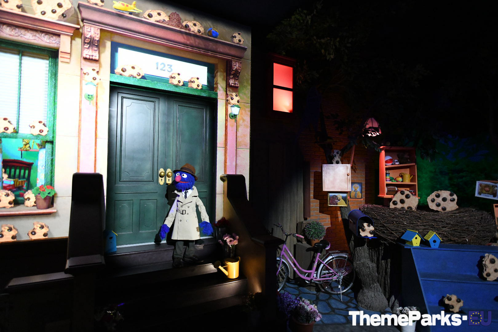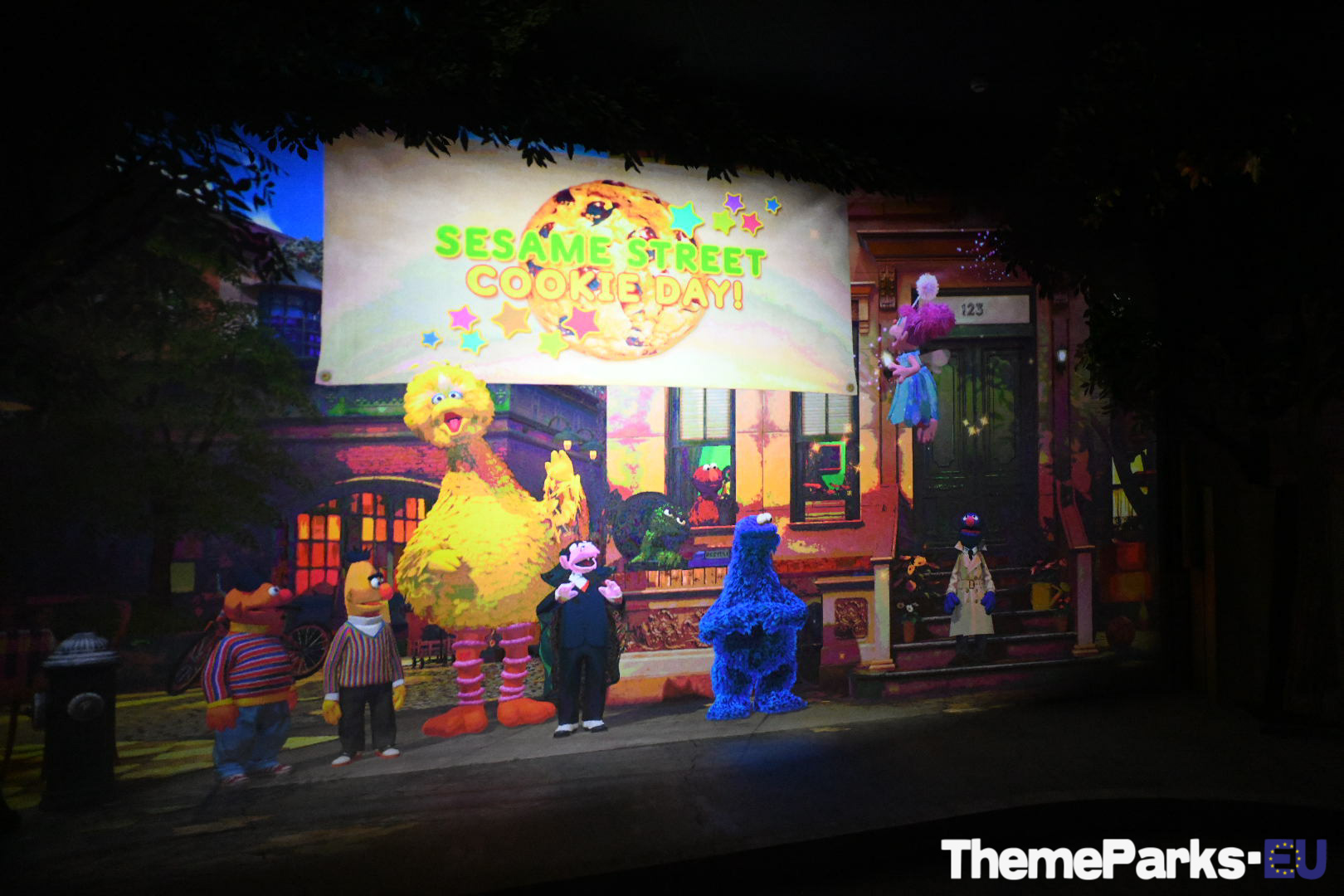 The premise of the ride is simple, the residents of Sesame Street have a big party planned and had baked a giant cookie for the celebration, but there is a problem... it's gone missing, and Grover the detective needs your help to find it. The almost 6 minute ride perfectly integrates detailed sets, 3D screens, animatronics and interactive gaming controllers that are called cookie collectors.